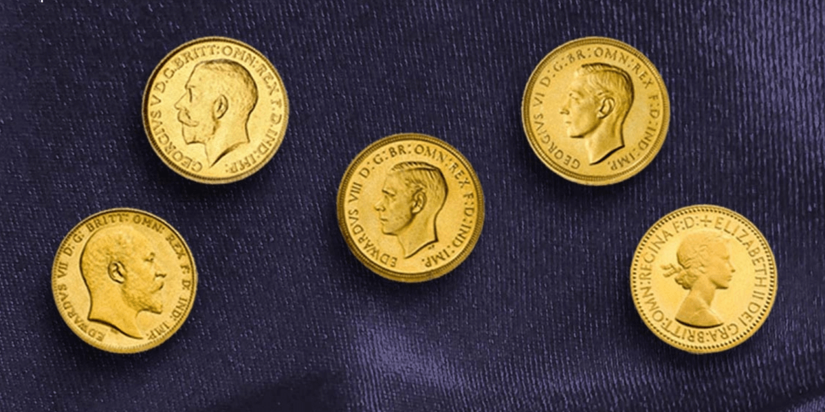 A series of sovereign obverses (left to right) Edward VII, George V, Edward VIII, George VI, Elizabeth II