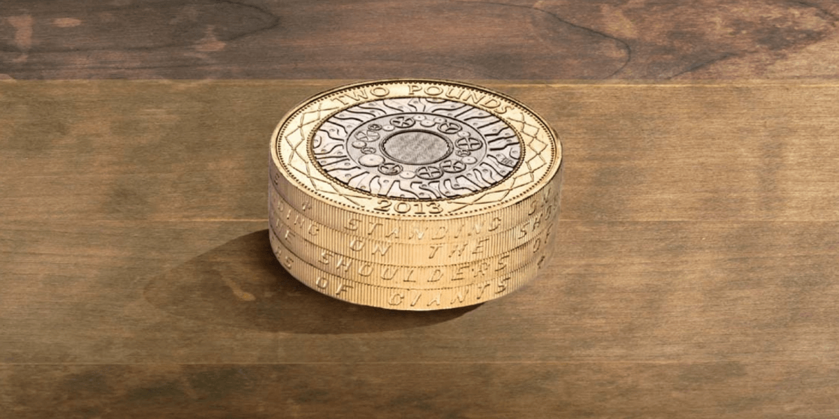 ‘STANDING ON THE SHOULDERS OF GIANTS’ are the words which run around the edge of the first bicolour £2 coin. It was felt to be an appropriate choice because of its association with Sir Isaac Newton, who attributed his great scientific achievements to the work of those who had gone before him: "if I have seen further, it is by standing on the shoulders of giants”. As Newton was once Master of the Mint, it seemed fitting to use his words on the newly introduced £2 coin of 1997, especially as its design was based on advances in science and technology.